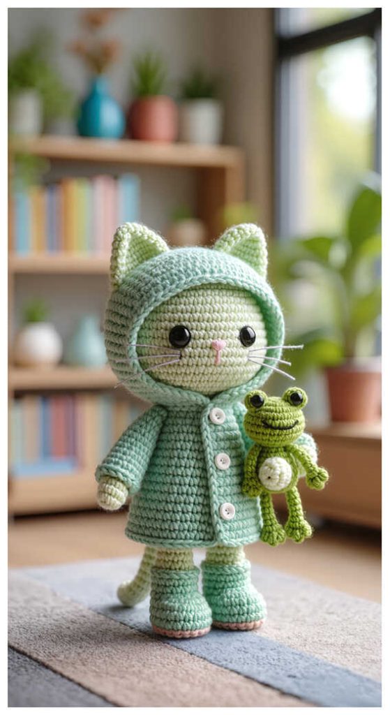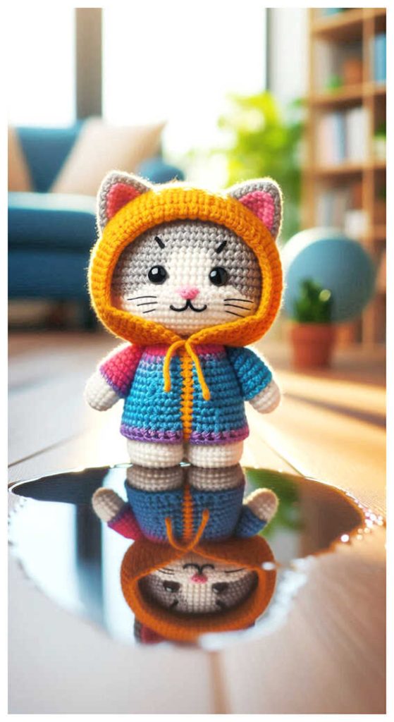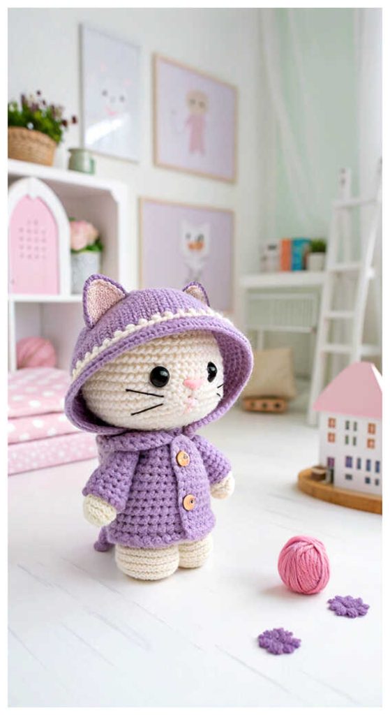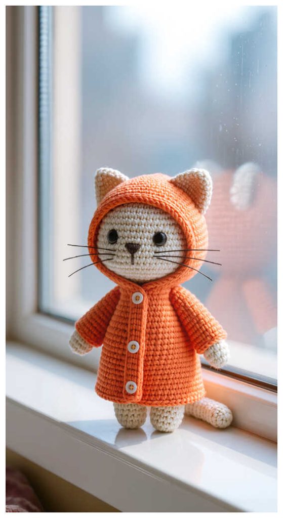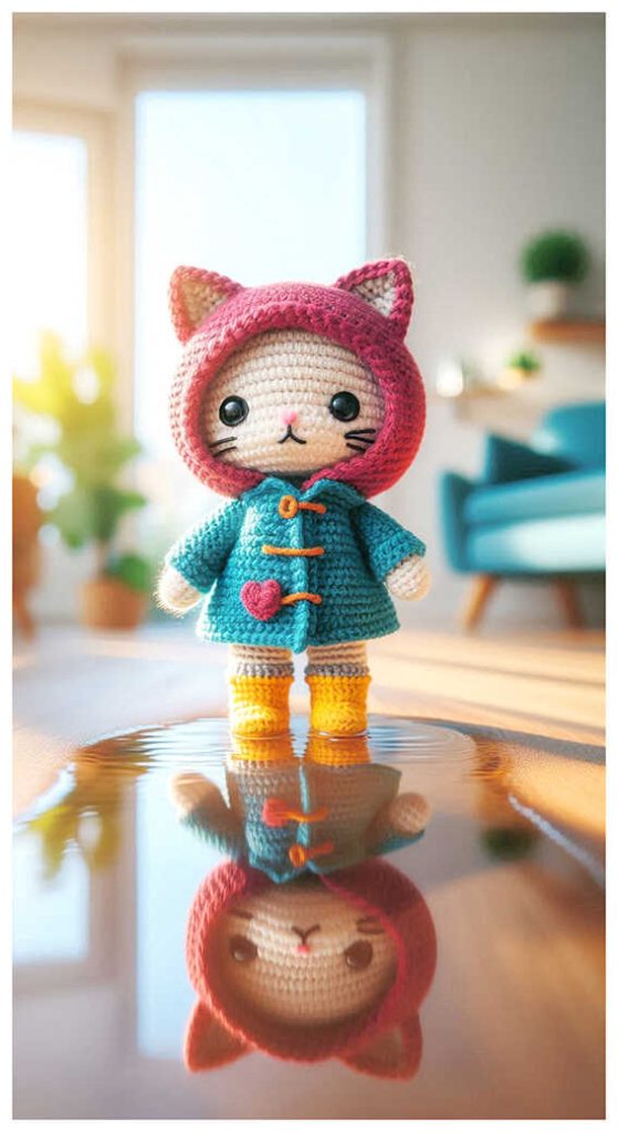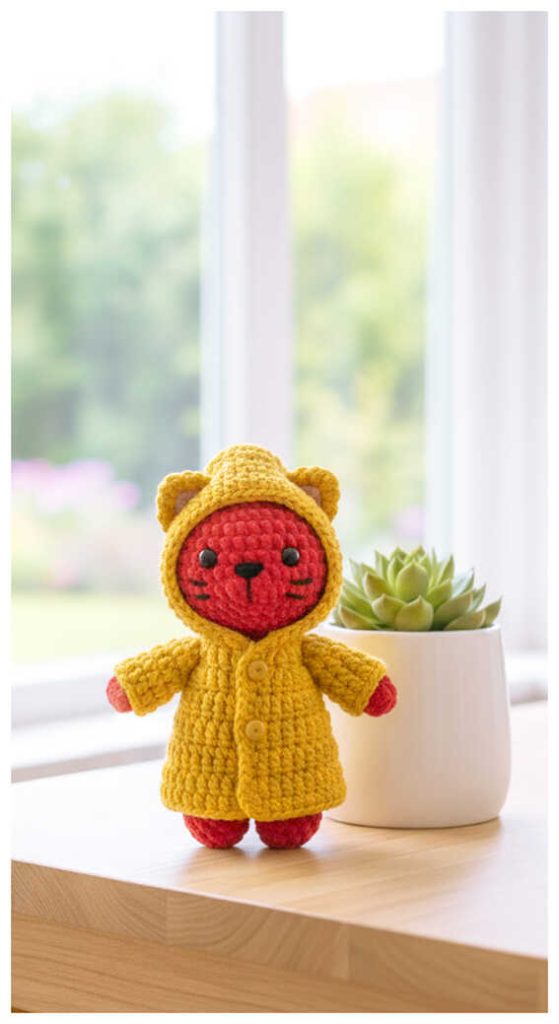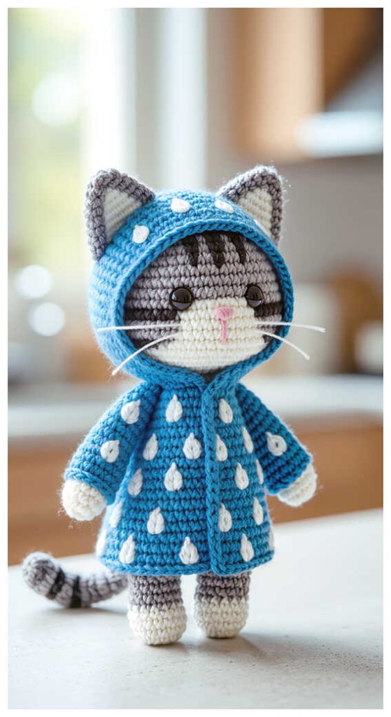 Bibi the Cat with Rain Costume Amigurumi Free Crochet Pattern by Dababi Atelie is a charming and heartwarming design that will melt your heart with its big, expressive 15mm eyes and adorable rain outfit! Created by the talented Bárbara Gonçalves, this cute kitty measures approximately 13cm tall when finished, making it the perfect size for gifts, desk decor, or handmade toy collections. The pattern is step by step and beginner friendly, so even if you’re new to amigurumi, you’ll enjoy every stitch of bringing this sweet little cat to life.