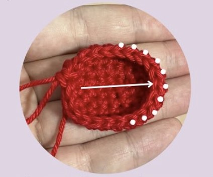 Introduce a new thread, and make 12 sc in the available stitches, including the sides, as per the dots marked in the photo.