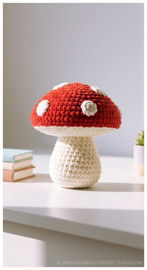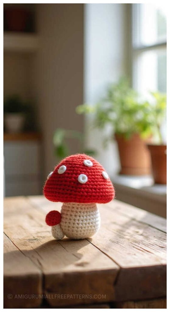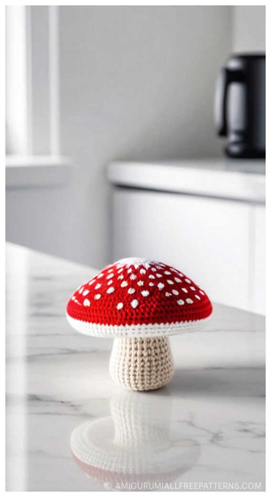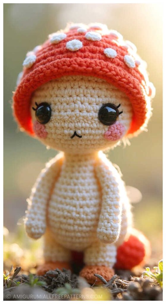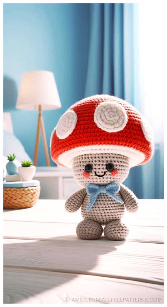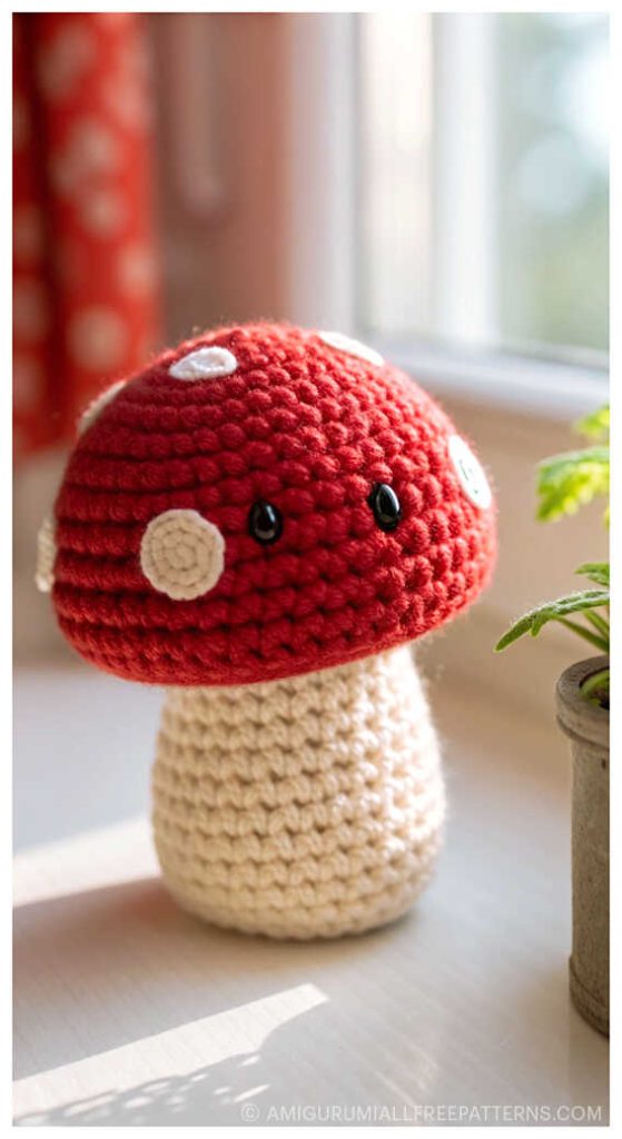 Crafted using YarnArt Jeans yarn (55% cotton, 45% acrylic, 50 g/160 m) and a 2.0 mm crochet hook, this pattern ensures a smooth, durable texture and vibrant color finish. You’ll also need 7 mm safety eyes, a tapestry needle, scissors, and fiberfill to bring your mushroom to life. Many thanks to Darya Neustroeva for this adorable and imaginative creation. Be sure to check the end of the pattern—there you’ll discover even more inspiring amigurumi mushroom ideas to continue your crochet journey!