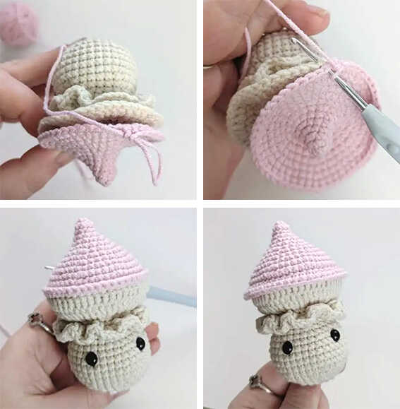 Put out the stem and cap together as shown in the picture and crochet through both parts with red/pink yarn:
