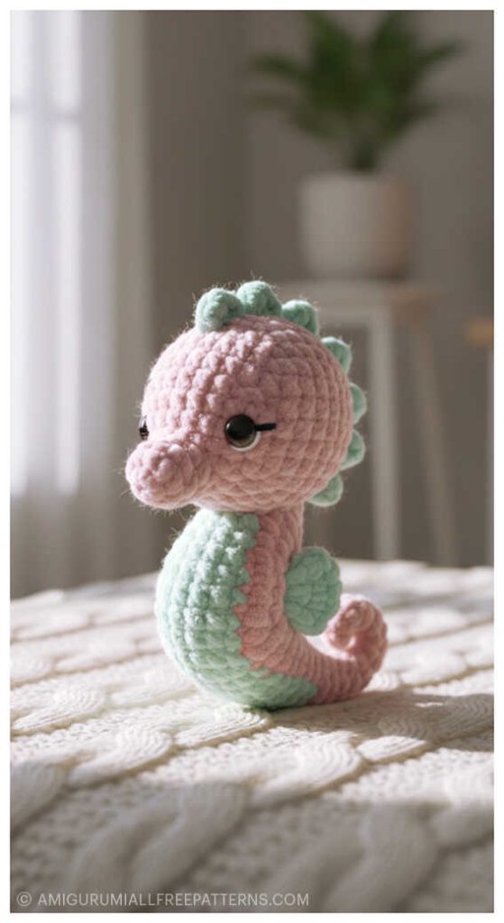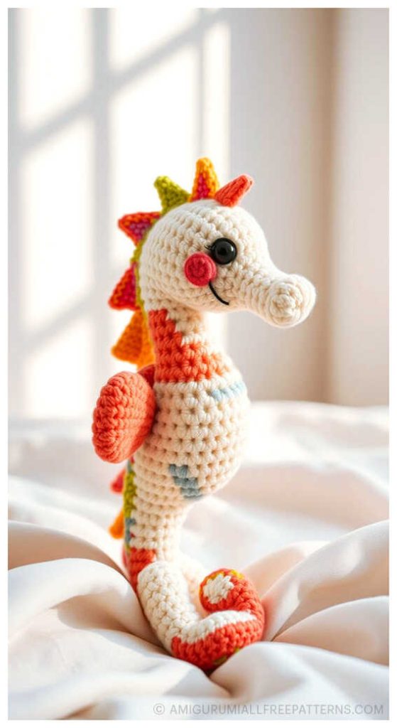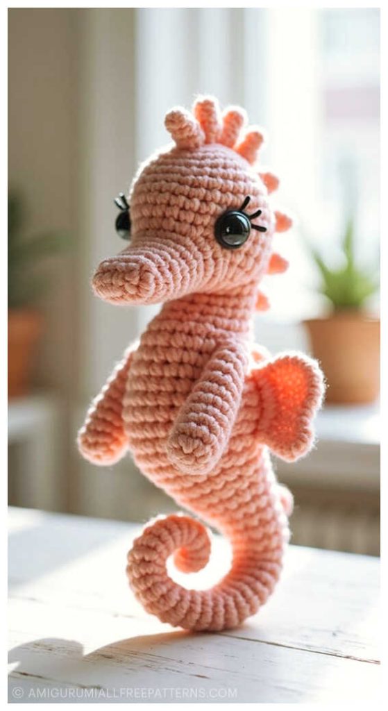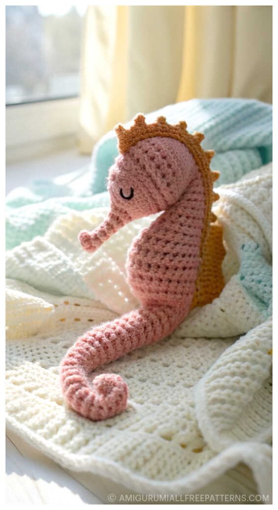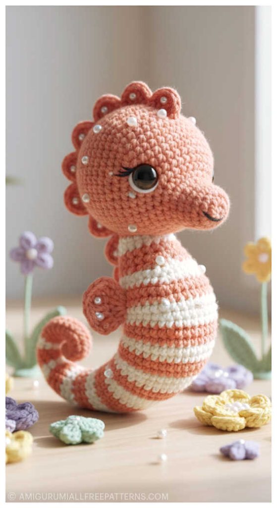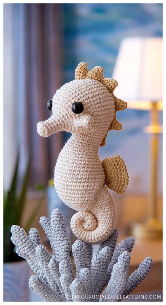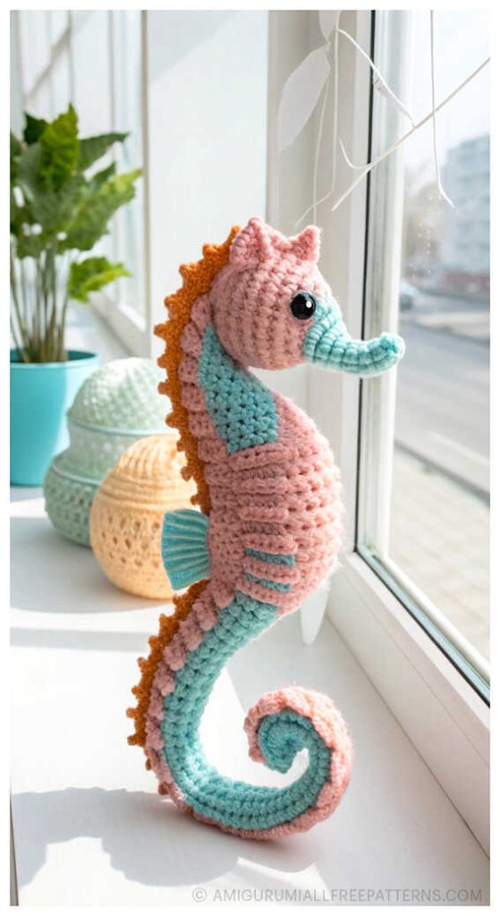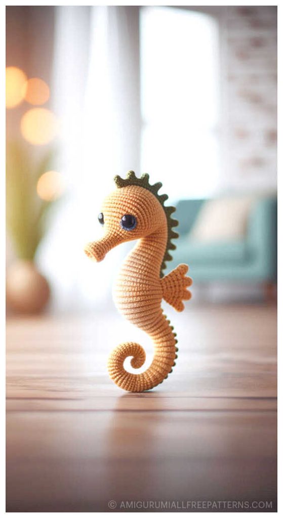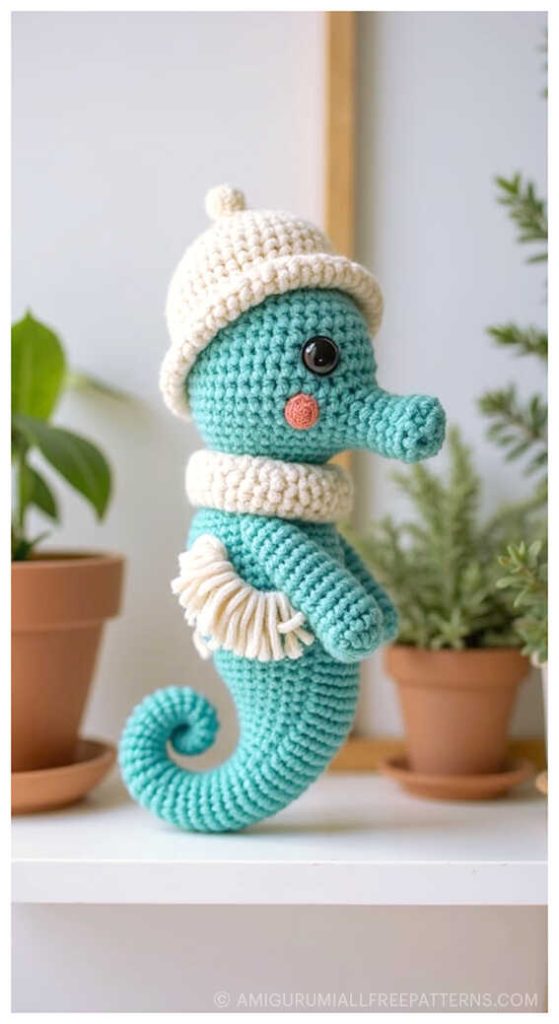 Mari’s thoughtful design ensures every detail—from the cute safety eyes to the delicate tail curl—comes together beautifully. With just a few simple materials like galvanized wire no. 20, a fine tapestry needle, and leftover white yarn, you’ll have everything you need to finish this lovely crochet seahorse. Be sure to check out the full pattern for more inspiration, and at the end, discover a collection of wonderful amigurumi seahorse ideas that will spark your creativity even further.