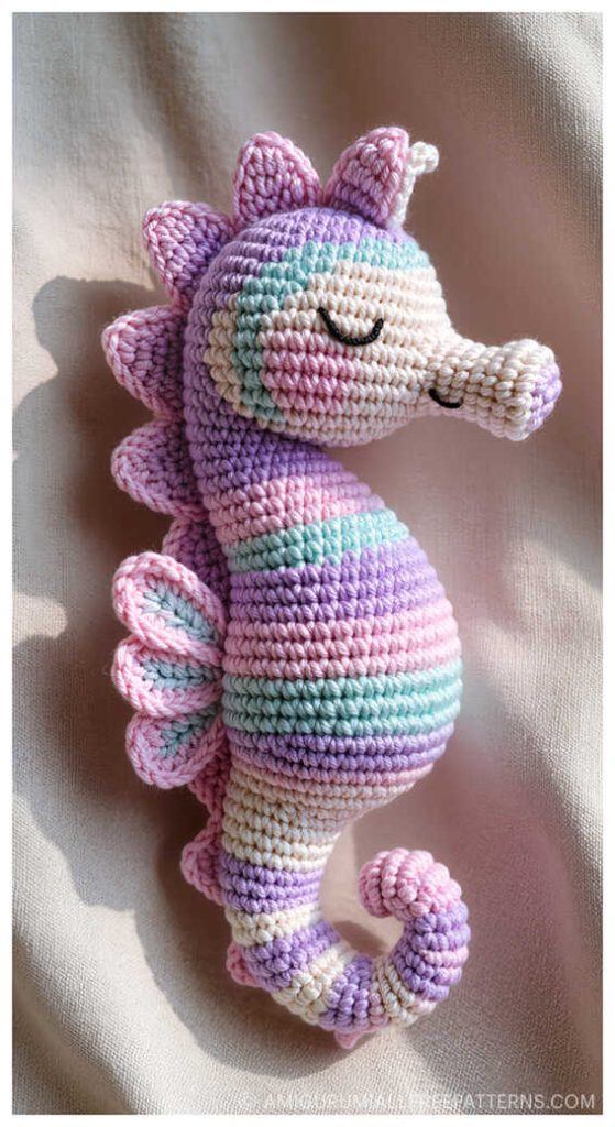 Looking for a sweet and simple sea-inspired crochet project? This Free Crochet Seahorse Amigurumi Pattern by Unique Amigurumis, designed by the talented Mari, is a delightful choice! Perfect for beginners, this step-by-step, beginner-friendly tutorial guides you through every stitch to create an adorable seahorse plush that looks straight out of a coral reef. Using soft amigurumi yarns in neomint, candy lilac, and cream, along with a 2.2mm crochet hook, you’ll bring this charming ocean creature to life with ease. The pattern’s easy difficulty level makes it a great project for anyone who wants to add a touch of marine magic to their handmade collection.